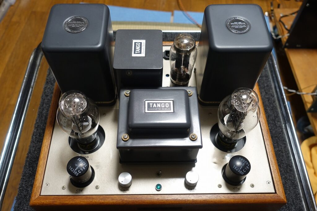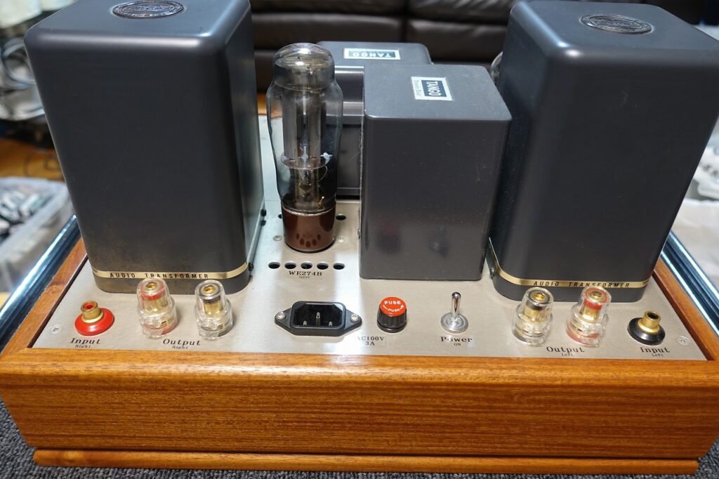 ガレージメーカーのパワーアンプをWE300Bシングルステレオアンプに手直ししました。使用球は2xC3g、2xWE300B、1xGZ37です。勿論、整流管にWE274Bも使用可です。前段のC3gはSiemens社製で3極管接続です。その分全体のゲインは下がりますが、パワフルで素直な音色です。使用トランスはOPTにタムラF-2004C、PTがTangoのMS-200CT、CHはMC-5-250D。特性は10Hz~20KHz+-1dB、最大出力6W+6W、残留ノイズ左右とも0.5mV以下。元々はNFBをかけていましたが、現在は無帰還です。美音です。
