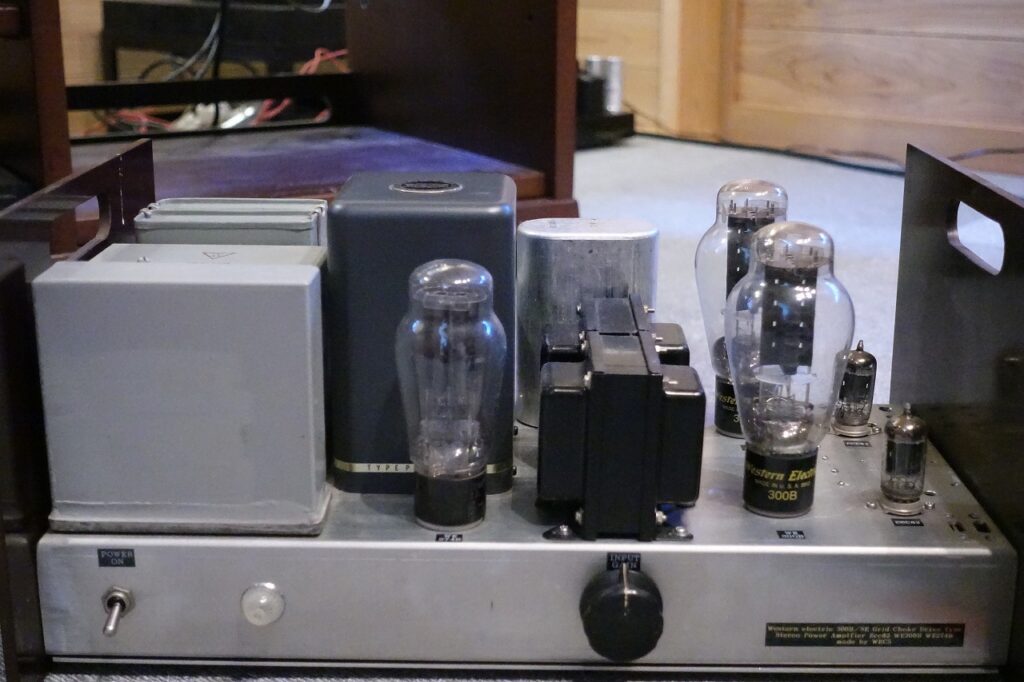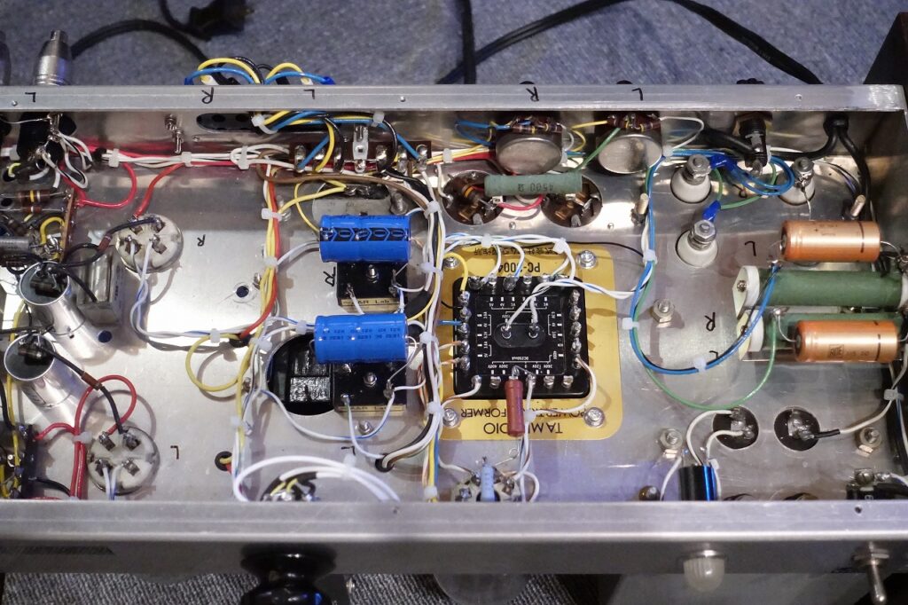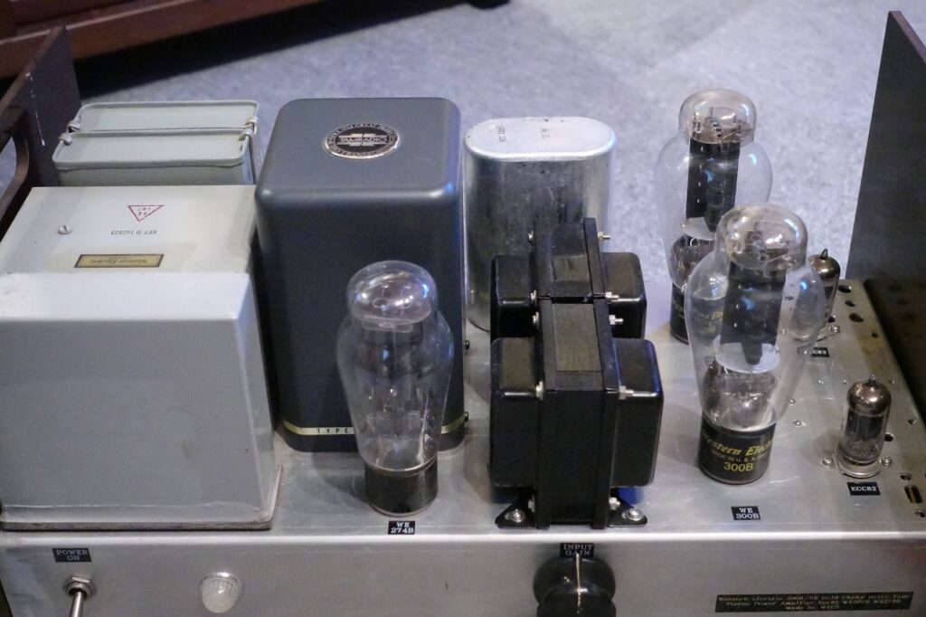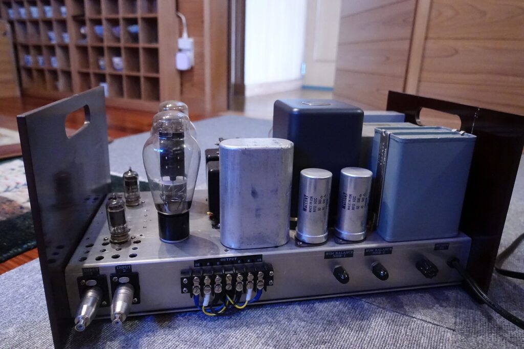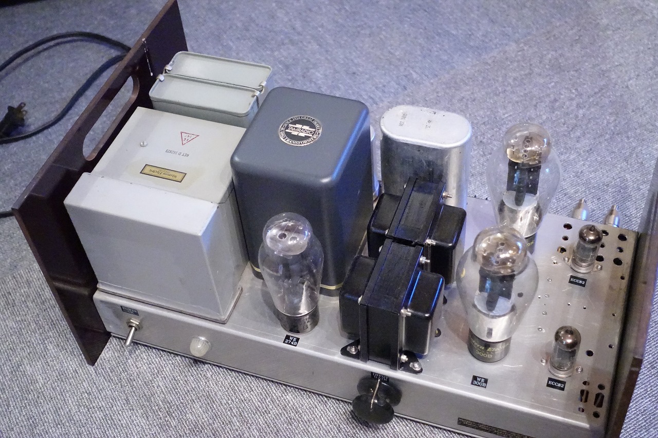 Western electric300Bを使用したステレオパワーアンプ。使用球は2xECC82、2xWE300B(98年製)、1xWE274B(刻印)。使用トランスは1xWE D162823チョーク、1xWE149チョーク、1xタムラPC3004電源、2xUTC O-3チョーク(グリッドチョーク)、2x特注シングル出力トランス。内部写真で分かる様、WEやSpragueのオイルコンを始め、USA製のビンテージパーツを使っています。出力は7W+7W、周波数特性20Hz~15KHz+-1dB、残留ノイズ1mV以下。見た目だけの中華製とは別次元です。